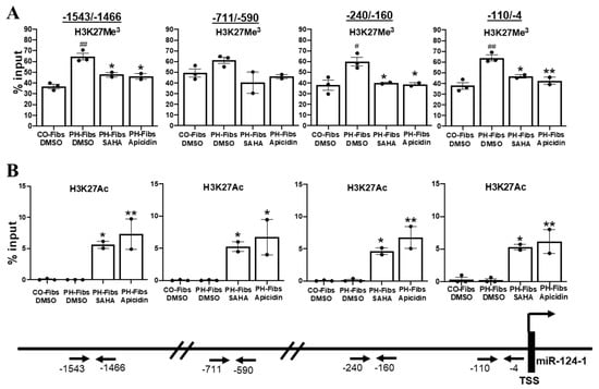 CO-Fibs, PH-Fibs, or PH-Fibs treated with HDACi, were cultured in 10% FBS medium in six 15 cm dishes. The cells were crosslinked using 1% formaldehyde in 1× PBS. After washing, cells were pelleted and lysed in RIPA buffer supplemented with 1× Halt protease inhibitor cocktail (1861279, Thermo-Fisher Scientific, Waltham, MA, USA), 1× Halt phosphatase inhibitor cocktail (78427, Thermo-Fisher Scientific, Waltham, MA, USA), 10 mM sodium butylate and 400 nM trichostatin A (T8552, Sigma-aldrich, St. Louis, MO, USA). The lysates were sonicated using Bioruptor Plus (12 cycles, 30 s on/30 s off, at high setting). Anti-acetylated H3K27 (#4353, Cell Signaling, Danvers, MA, USA), or Anti-trimethyl-H3K27 (#9733, Cell Signaling, Danvers, MA, USA) antibodies and Dynabeads M-280 Sheep anti-Rabbit IgG (11203D, Invitrogen, Carlsbad, CA, USA) were used to pull down chromatins. Detection by qPCR was performed for the regions, −1543/−1466, −711/−590, −240/−160, −110/−4, of miR-124-1 gene and the data is presented as % input.
