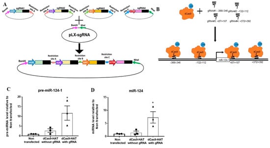 The data above indicated that HDACi increases miR-124-1 gene transcription and H3K27Ac levels on the gene regulatory regions of miR-124-1 gene in human PH-Fibs. However, these studies only provided association between increased miRNA-124 transcription and increased histone acetylation of miRNA-124-1 gene because HDACi is expected to regulate numerous target proteins including non-histone proteins such as TFs and signaling molecules in cells that also can promote miR-124-1 gene transcription. Thus, a strategy to increase histone acetylation at the miR-124-1 gene, and only at the miR-124-1 gene, is needed to transform the above-found association-based findings into mechanistic principles of gene regulation. One way to do so is through the use of CRISPR-Cas9 nuclease as we previously published [21]. CRISPR-Cas9 nuclease (clustered, regularly interspaced, short palindromic repeat–CRISPR-associated protein 9) can be directed to specific genomic loci using complementarity between an engineered guide RNA (gRNA) and the specific DNA sequence. The DNA-cut activity of the Cas9 nuclease can be abolished by mutating the RuvC and HNH domains, generating the nuclease-activity deficient Cas9 (dCas9). Fusion of dCas9 with the catalytic core domain of histone acetyltransferases (HAT domain of p300 is used in this study) will deliver the HAT activity to the specific DNA region, specified by the gRNA [22,23,24]. Studies using the dCas9-epigenetic enzyme showed that using 4-5 gRNAs, rather than just one gRNA, to deliver the dCas-9-enzyme across the 600 bp DNA surrounding the transcription start site is more effective in altering epigenetic marks and gene expression [25]. Thus, we first generated a plasmid that can express 4 different gRNAs (gRNA sequences in Supplemental Table S2), based on the Gateway strategy [26] in which 4 different promoters (human H1, human U6, human 7SK and mouse U6, all are RNA pol III promoters) control expression of 4 different gRNAs complementary to miR-124-1 gene (Figure 6A). These gRNAs are designed to deliver dCas9-p300 to 4 different regions of the miRNA-124-1 gene, around the transcription start sites (Figure 6B). Indeed, co-transfection of dCas9-p300, with a single plasmid expressing 4 gRNAs complementary to 600 bp of the miR-124-1 gene promoter, but not dCas9-p300 alone, significantly increased the RNA levels of pre-miR-124-1 (Figure 6C) and mature miR-124 (Figure 6D). These data demonstrated that increased histone acetylation on the miR-124-1 gene could increase miR-124-1 gene transcription, thereby showing that HDACi-mediated increased miR-124 transcription is due to increased acetylation of the miR-124 gene.