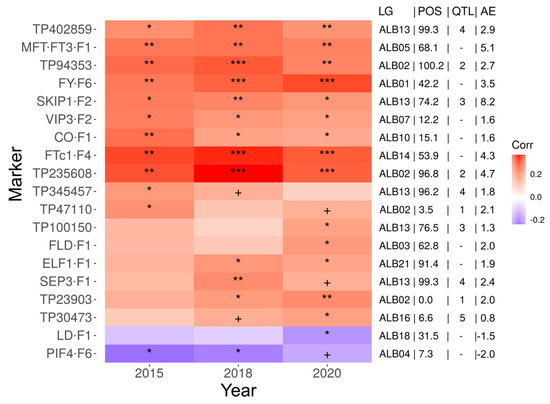Correlation between the phenotype (the number of days from sowing to flowering) and the genotype (marker segregation) in white lupin germplasm collection. Color scale visualizes Spearman’s rank correlation coefficient values (Corr). Abbreviations are as follows: LG, linkage group; POS; position in the linkage group in centimorgans; QTL, the number of assigned QTL; AE, additive effect (See Supplementary Table S4). *** p value <0.001; ** p value < 0.01; * p value < 0.05; + p value < 0.1.