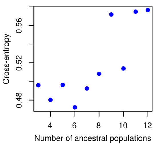 Cross-entropy values obtained for a given number of clusters (ancestral populations).
