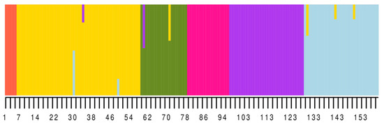 Molecular analysis of variance (AMOVA) supported the hypothesis that such a grouping into subpopulations is not random (simulated p-value: 9.999 × 10−5). Membership of all genotypes to six subpopulations were visualized by the ancestry matrix (Figure 4).