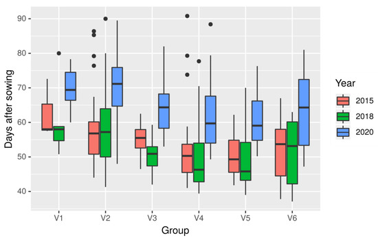 Plants in these subpopulations showed the following mean values of number of days from sowing to flowering: V1, 64.5 ± 9.5 days; V2, 62.8 ± 12.0; V3, 57.7 ± 9.0; V4, 54.9 ± 10.8; V5, 53.9 ± 8.9; and V6, 55.8 ± 11.5 days. There were significant differences between years (p-value < 2 × 10−16) and groups (p-value 3.7 × 10−11) and no significant interaction between years and groups (p-value 0.996) (Figure 5).