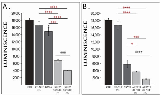 For cell viability estimation, we used the CellTiter-Blue® Cell Viability Assay (Promega, Madison, WI, USA). Following cell attachment, the cells were incubated with the CD-NHF at 5% concentrations (50 µg/mL), K252A (5 nM) (Sigma-Aldrich, 420297, St. Luis, MO, USA), AKTVIII (1.7 µM) (Sigma-Aldrich, 124018, St. Luis, MO, USA), CD-NHF-K252A, or CD-NHF-AKTVIII for 72 h. In combined treatments we tested both 1% (10 µg/mL) or 5% CD-NHF (50 µg/mL). After each of the 72 h treatment time periods, 50 μL of cell viability solution was added to each well, and the plate was reincubated for 4 h before fluorescence recording using a multiple microplate reader (FilterMax F5, Sunnyvale, CA, USA).