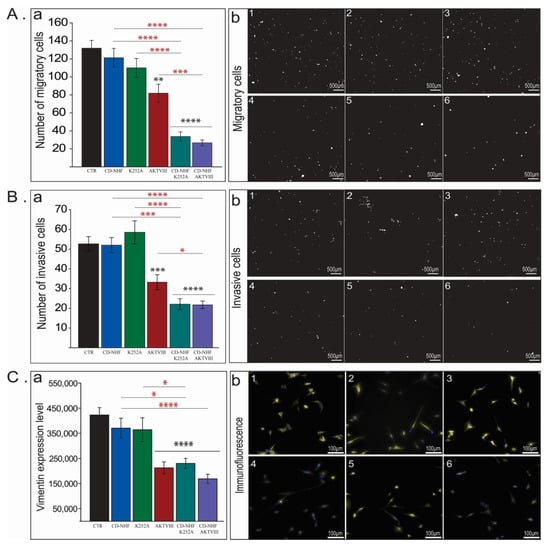 The effect of CD-NHF, K252A and AKTVIII inhibitors on U87 cell migration and invasion. (A) Cell Migration. (a) Quantification of migratory cells. (b) Representative images of migratory cells. (B) Cell Invasion. (a) Quantification of invasive cells. (b) Representative images of invasive cells (nuclei—white colour). (C) Vimentin expression levels of 2D cultured cells. (a) Quantification of vimentin. (b) Representative images (vimentin—yellow colour, nuclei—blue colour). (1). Control (untreated), (2). 1% CD-NHF, (3). K252A (5 nM), (4). AKTVIII (1.7 µM), (5). K252A + 1% CD-NHF, (6). AKTVIII + 1% CD-NHF. Pictures acquired at 10× (A and B) and at 20× ©. Scale bars are 500 µm (A and B) and 100 µm (C). * p < 0.05; ** p < 0.005; *** p < 0.0005; **** p < 0.00005.