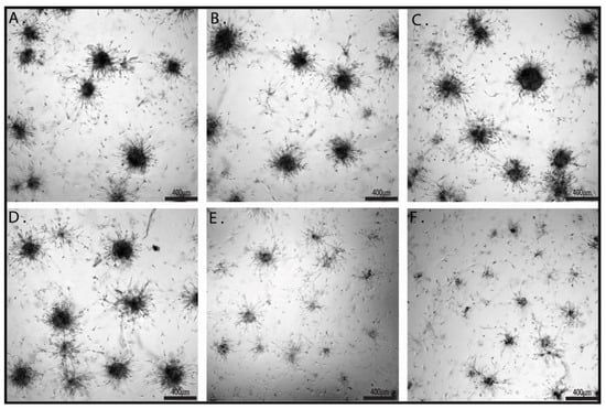 Cell viability/proliferation and invasiveness can be investigated at the same time in a higher-level cell culture system, a 3D culture system. Cells are cultivated in a matrigel that allows them to form spheroids. Inside of the bigger spheroids, starvation occurs, leading to apoptosis and the formation of microenvironmental niches. This reproduces cell interaction in a more complex way. The size of the spheroids reflects cell viability/proliferation, while invasive projections correlate with invasiveness. Brightfield microscopy investigation of formed spheroids (Figure 3) further proved the efficiency of combined treatment by both spheroid size reduction and by impairment of invasive projections. Fluorescence imaging of the spheroids is provided in Supplementary Figure S1.