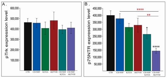 Assessment of TrkB phosphorylation and p75 neurotrophin receptor (p75NTR) expression levels. (A) TrkB phosphorylation. (B) p75NTR. Combined treatments has been also compaired with their corresponding single treatment groups (red *). * p < 0.05; ** p < 0.005; **** p < 0.00005.