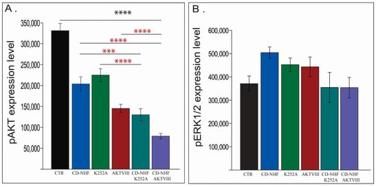 Trk receptors activate several molecular cascades, including PI3K/Akt, MAPK/ERK, and PLCγ pathway. In addition to K252A/Trk inhibition, the PI3K/Akt pathway can be inhibited directly by AKTVIII. The K252A used working concentrations do not inhibit all three Trk receptor types, while the AKTVIII inhibitor inhibited only Akt1/Akt2 subtype without inhibiting the Akt3 isoform. Our data (Figure 5A) demonstrates a significantly decreased phosphorylation level of pan-pAkt not only in K252A and AKTVIII treated groups but also in the CD-NHF treated group, relative to the control group. Moreover, the decrease in phosphorylation levels was even higher by combined treatments (Figure 5A), even when compared with their corresponding individual treatments.