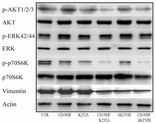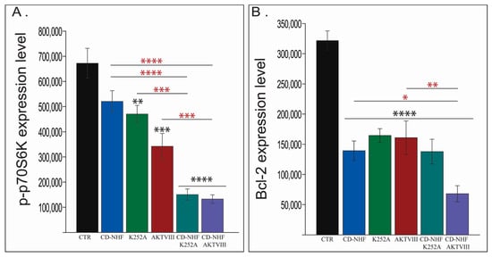 P70S6 kinase represents another key member of the PI3K/Akt/mTOR molecular cascade and plays a key role in protein synthesis, cell survival, and cell growth []. Our experimental data (Figure 6A) identified a non-statistically significant decrease in p70S6 kinase phosphorylation in CD-NHF and a significant reduction in both K252A and AKTVIII treated groups (Figure 6A). In addition, the decreased phosphorylation was found even higher in combined treatment groups compared with the control group (Figure 6A) and single treatment groups. Decreased p70S6 kinase phosphorylation correlated with impairment of cell viability and further proves the efficiency of the combined treatments.