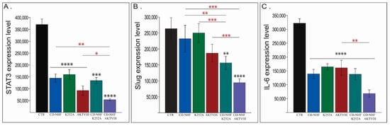 Assessment of STAT3, Slug and IL-6 expression levels. (A) STAT3. (B) Slug. (C) IL-6. Combined treatments compared with their corresponding single treatment groups (red*). * p < 0.05; ** p < 0.005; *** p < 0.0005; **** p < 0.00005.