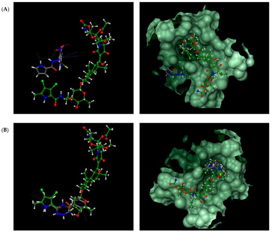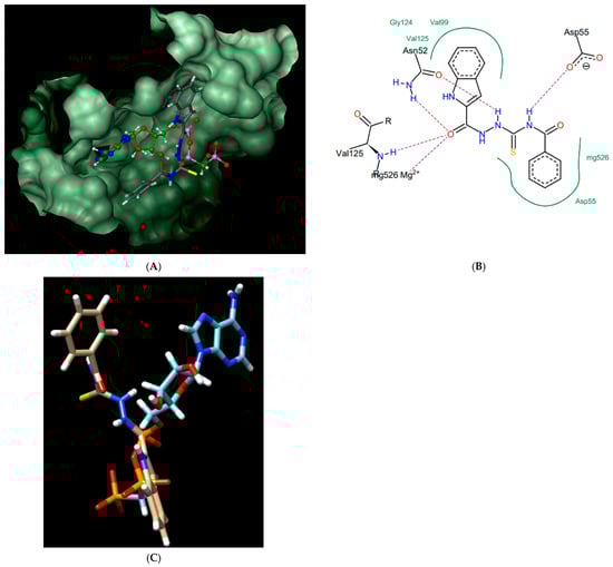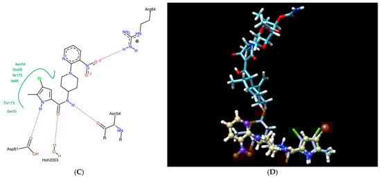 Compound 7, which was later found to be the most active against two strains of the Mycobacterium genus, was also studied for its binding potential in the ATPase region of Mycobacterium tuberculosis GyrB protein (PDB entry: 3ZM7), where it was predicted to bind with a higher affinity than predicted for the native inhibitor, AMPPCP (−27.1 vs. −23.0). As presented in Figure 6, it binds to the same site as AMPPCP and is stabilized by several hydrogen bonding interactions and close hydrophobic contacts with the surrounding amino acids. However, this observation was not confirmed later in the in vitro assay against the supercoiling activity of M. tuberculosis gyrase (data not shown).
