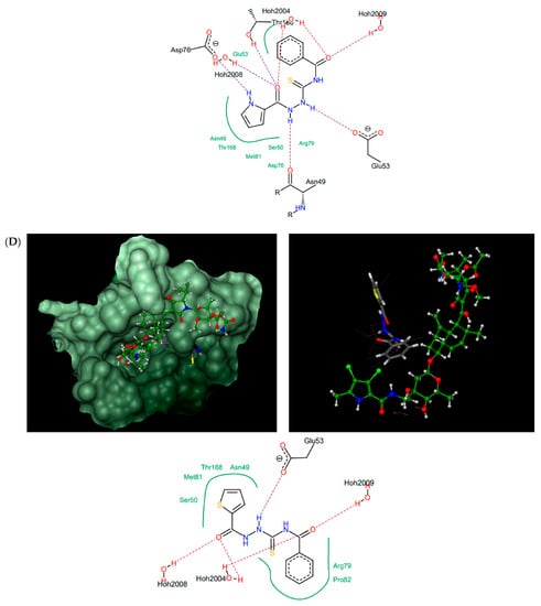- Siwek, A.; Stączek, P.; Wujec, M.; Stefańska, J.; Kosikowska, U.; Malm, A.; Jankowski, S.; Paneth, P. Biological and docking studies of topoisomerase IV inhibition by thiosemicarbazides. J. Mol. Model. 2011, 17, 2297–2303. [Google Scholar] [CrossRef]