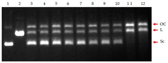 According to the docking studies, there was sufficient evidence that at least the inhibitors that form H-bond interactions with Asp76 (Asp81), i.e., 4, 5, 6, 7, and 8, should exhibit inhibition of ATPase activity of type IIA topoisomerases. However, among these compounds, only 4 and 7 showed strong inhibitory activity when tested in vitro against the purified enzymes, and in both cases, it was the decatenation process conducted by topoisomerase IV that was affected the most (Figure 1). To provide experimental confirmation of the assumption that the observed inhibition of decatenation by topoisomerase IV indeed may be due to the impairment of ATPase activity and not its cleavage ability, two enzymatic tests were performed. Inhibition of the resealing process after the introduction of the double-stranded break in the DNA, proven for fluoroquinolone antibiotics, results in the accumulation of double-stranded DNA breaks and, finally, in bacterial cell death [50]. Their inhibitory action against bacterial DNA topoisomerases might be due to their interactions with DNA within the cleavage complex. Thus, in the first test, we subjected compounds 4 and 7, as well as norfloxacin, a common drug from the fluoroquinolones group, to the non-radiolabeled cleavage assays with a supercoiled pBR322 used as the substrate. The appearance of linear DNA formed during denaturation of the drug–enzyme–DNA complex was monitored. The relaxed, linear, and supercoiled DNA forms were resolved and visualized by agarose gel electrophoresis followed by ethidium bromide staining. The inhibitory activity of norfloxacin was observed at a concentration of ≥10 µM (Figure 7, lanes 10–12). In contrast, no increase in linear plasmid DNA was detected for compounds 4 and 7 when tested at concentrations ranging from 0.1–100 µM (Figure 7, lanes 3–9).