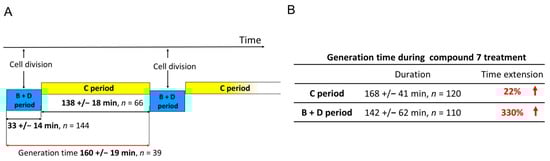The duration of the C and the B + D periods during the cell cycle of M. smegmatis expressing DnaN-EGFP protein fusion (JH01 strain) measured under optimal growth conditions (A) and when treated with compound 7 (B).