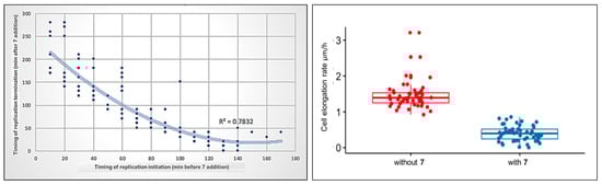 Correlation between the timing of compound 7 addition and replication initiation or termination during the cell cycle of M. smegmatis DnaN-EGFP (JH01) (left). M. smegmatis DnaN-EGFP (JH01) cell elongation (right) during treatment with compound 7 (blue dots) and before treatment during growth in optimal conditions (red dots). The difference was statistically significant with p = 1.4 × 10−28, n = 50.