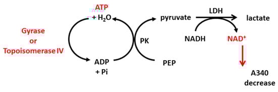 Thiosemicarbazide derivatives 4 and 7 were also studied for their ability to interrupt the ATP hydrolysis reaction of topoisomerase IIA using the E. coli topoisomerase IV ATPase kit and S. aureus topoisomerase IV ATPase kit (INSPIRALIS, Norwich, UK, cat no. ATPECT001, ATPSAT001). Class IIA topoisomerases use energy from ATP hydrolysis for their proper action (supercoiling or decatenation). Some drugs, such as coumarins (e.g., novobiocin), inhibit hydrolysis by competing with ATP molecules for a binding site on the enzyme. The ATPase assay is based on the conversion of phosphoenolpyruvate (PEP) to pyruvate kinase (PK), coupled with the conversion of pyruvate to lactate by lactate dehydrogenase (LDH). This step requires NADH, which is oxidized to NAD+. NADH absorbs strongly at 340 nm but NAD+ does not; thus, the reduction of NADH over time can be measured by a decrease in absorbance (Scheme 1). The reaction was performed in 96-well, clear flat-bottomed plates and the protocol for gyrase and topoisomerase IV was the same. In brief, 1 U of the enzyme was incubated at 37 °C in a final volume of 100 μL containing 1× assay buffer, 800 μm PEP, 400 μm NADH, 1.5 μL PK/LDH, 10 nm linear pBR322 and the tested compound at a final concentration of 20 µM. Also, novobiocin at 20 µM was used as a control inhibitor. The mix was equilibrated for 10 min at 37 °C. The hydrolysis reaction was then initiated by the addition of ATP (2 mM) and the decrease in A340 was measured for 1 h at 5 min intervals. The decrease in OD340 over time was converted to ATP hydrolysis rate using an extinction coefficient of 6.22 mM−1 × cm−1 for NADH (and assuming 1 NADH molar equivalent to 1 ATP mol), and the percentage of inhibition compared to the untreated control was determined.