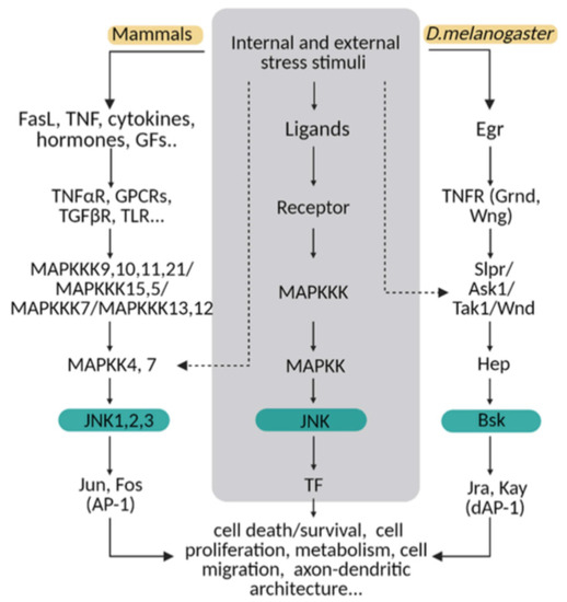The molecular MAPK cascade presents high homology from Drosophila to mammals (Figure 1) [11]. In Drosophila, JNK pathway-signalling is initiated by the interaction of the ligand protein Eiger (Egr), the unique TNF superfamily member of ligands [12,13], with TNF receptors (TNFRs) Grindewal (Grnd) [14], or Wengen (Wng) [15]. Ligand–receptor interaction initiates a cascade of phosphorylations that mediates the JNK signalling pathway [11]. In Drosophila, JNK is encoded by a single gene: basket (Bsk); this simplifies the genetic studies that have contributed to decipher the role of JNK under physiological and pathological stressful scenarios [16,17]. In mammals, the JNK cascade involves four kinases, and mitogens or cytokines induce MAP3K family activation [11]. MAPK cascade triggers cytosolic JNK dual phosphorylation and initiates the phosphorylation of cytoplasmic and nuclear proteins [18], including cytoskeletal and mitochondrial proteins, nuclear transcription factors, membrane proteins or nuclear hormone receptors [19]. Thus, gene expression derived from JNK activation leads to a variety of responses, depending on the cell type and the scenario [11]. In mammals, the JNK pathway is encoded by jnk1, jnk2 and jnk3 [20]. JNK1 and JNK2 are found ubiquitously, whereas JNK3 is restricted to the brain, cardiac smooth muscle and testis [20,21]. In particular, the JNK pathway is highly active in the CNS as compared with other tissues. Therefore, it emerges as a critical regulator of CNS cells under physiological and pathological conditions [22,23]. It has been demonstrated in mouse that different JNK isoforms undergo compensatory mechanisms during early brain development. Although a single deficiency of each JNK isoform is viable, the mutants still present different phenotypes, highlighting the importance of each individual enzyme (reviewed in [23]). Besides, each isoform has different temporal and regional expression patterns (reviewed in [21]).