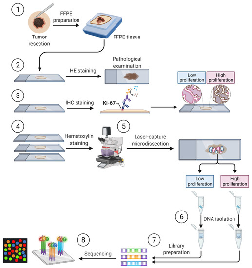 General overview of sample processing. (1) Preparation of archival formalin-fixed paraffin-embedded (FFPE) originated from primary cutaneous melanoma tumors. (2) Staining with hematoxylin and eosin (HE) for the pathologist examination. (3) Immunohistochemistry staining with anti-Ki67 antibodies to determine the compartments of high and low proliferation. (4) Hematoxylin staining and laser-capture microdissection. (5) The laser-capture microdissection of compartments of high and low proliferation based on Ki-67 staining. (6) Digestion with proteinase K and DNA isolation followed by DNA quantity and quality assessment. (7) Preparation of libraries for amplicon-based next-generation sequencing of a panel of cancer-related genes. (8) Targeted next-generation sequencing.