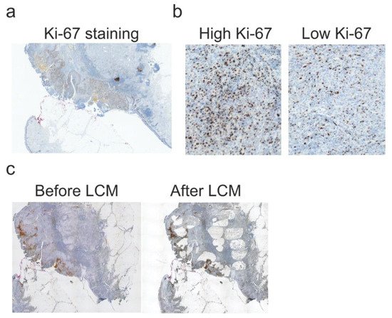 Subsequent sections of melanoma tumors were stained with hematoxylin and subjected to laser-capture microdissection (LCM)-aided dissection of two regions of each tumor tissue—exhibiting high proliferation (HP) and low proliferation (LP). The pattern of proliferation was determined based on the density of Ki-67-positive cells revealed by immunohistochemical staining with anti-Ki-67 antibodies (Figure 2). HP and LP compartments were defined as areas of tumor cells with higher (HP) or lower (LP) density of Ki-67-positive cells compared to mean density for the whole tumor slice. Regions of more than 10% Ki-67-positive tumor cells were considered HP (preferably and mainly areas of >50% positive staining were dissected), and compartments of less than 10% Ki-67-positive cells were considered LP.