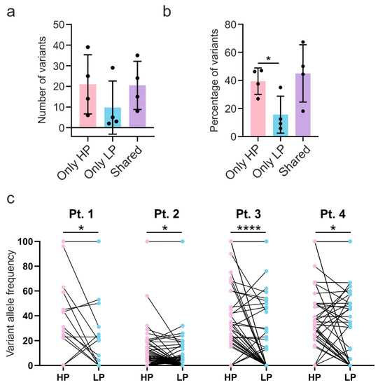 Most of the mutations were detected only in HP compartments (Figure 4). Nonetheless, shared variants detected in both HP and LP also constituted a substantial percentage of variants. In contrast, variants detected only in LP compartments were rare.