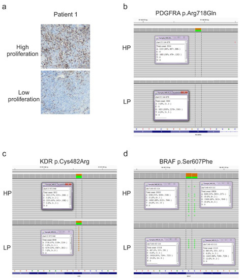 Representative molecular characteristics of patient 1. (a) Representative microphotographs of Ki-67 staining of chosen compartments of high proliferation (HP) and low proliferation (LP) of melanoma tissue. Magnification 20×. (b) p.Arg718Gln mutation in PDGRFA gene as a representative variant detected only in HP compartment. (c) p.Cys482Arg mutation in KDR gene as a representative variant detected in similar variant allele frequency (VAF) in both compartments. (d) p.Ser607Phe variant in BRAF gene as a representative variant detected in both compartments but with substantially higher VAF in HP (31%) than LP (4%) compartment.