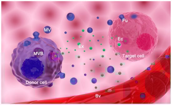 Extracellular vesicles (EVs) release and transfer. EVs comprise exosomes (Exs), microvesicles (MVs), and apoptotic bodies (not shown). Exs are released from a donor cell upon fusion of a multivesicular body (MVB) with the plasma membrane. Microvesicles (MVs) are formed by budding of the originating cell’s plasma membrane. EVs reach target cells of the same tissue or they are transferred by body fluids to distant cells (i.e., EVs enter blood vessels (Bv) and are transferred by blood to distant organs/tissues/cells). EVs may deliver information to the target cell by (a) fusion (Fu) with its plasma membrane; (b) endocytosis (Ec) of EVs by target cells; or (c) interaction of surface molecules on EVs and the cell (not shown).