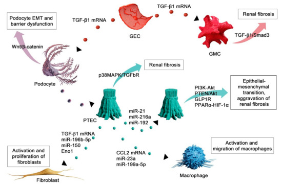 It has been demonstrated that crosstalk between podocytes and renal tubular cells has an important role in the development of renal fibrosis. Indeed, exposure of tubular epithelial cells to microparticles (MPs) isolated from cultured media of untreated differentiated human podocytes led to a significant pro-fibrotic response [81]. Podocyte MPs increased p38 and Smad3 phosphorylation and expression of the ECM proteins fibronectin and collagen type IV in cultured PTECs. Antagonism of cell surface scavenger receptor CD36 abrogated all podocyte MP-induced responses in PTECs [81]. Wu et al. 2017 [82] pointed to intercellular crosstalk between cells of the glomerulus as an essential step in the pathogenesis of renal fibrosis. Namely, the authors demonstrated that glomerular endothelial cells (GECs) treated with high glucose (HG) underwent endothelial–mesenchymal transition (EndoMT) and secreted exosomes enriched with TGF-β1 mRNA. After being internalized by podocytes, GEC-derived exosomes mediated EMT and barrier dysfunction through the Wnt/β-catenin signaling pathway. The authors proposed a role for paracrine communication via exosomes as important for the progression of renal fibrosis in diabetic nephropathy. The same group also demonstrated that exosomes containing TGF-β1 mRNA released by HG-treated GECs could activate mesangial cells in the glomerulus to promote renal fibrosis through the activation of TGF-β1/Smad3 signaling pathway [83].