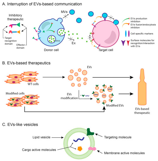 EV-targeted/based therapeutic approaches. (A) In the first approach, an interruption of EV-based communication between cells can be achieved by different chemical compounds that inhibit specific pathways of EV biogenesis or uptake. However, those compounds may exert their effects in a nonselective manner, thus affecting every cell in the organism that comes in contact with them. This issue could be resolved by combining chemical compounds with targeting moieties. (B) In the second approach, EVs can be used as therapeutics, either in their native form (such as MSC-EVs) or after their modification (loading with drugs, miRNA, and/or target molecules). These modifications can be achieved by direct manipulation of isolated EVs or by engineering the cells that produce them. (C) The third approach represents a design of EV-like vesicles consisting of lipid bilayer vesicles carrying targeting molecules and active components as cargo or membrane molecules.