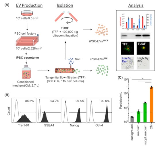 Large-scale production of induced pluripotent stem cell-derived extracellular vesicles (iPSC-EVs). (A) Schematic representation of large-scale EV production from iPSCs. After culture in six-well plates, iPSCs were transferred directly to T225 flasks and then to four-layered cell factories. Culture-conditioned medium (CM) was pooled and separated into soluble factors (SolF) and enriched EVs by tangential flow filtration (TFF). For further concentration and protein depletion, TFF-enriched EVs were submitted to ultracentrifugation (TUCF). Comparative EV analysis included particle, protein and EV identity determination as illustrated plus single EV phenotyping and function tests. (B) Identity and purity of human iPSCs determined by Tra-1-81, SSEA-4, Nanog, OCT-4 flow cytometry (representative data shown). (C) Particle concentration during EV production measured by tunable resistive pulse sensing (TRPS) in background (PBS + 0.05% Tween 20, 0.22 µm pore filtered), basic and supplemented defined serum-free medium (mTeSR™1) before and after culturing cells. Mean ± SEM of three independent experiments; individual results for CM are shown in Figure 2A. Dotted line represents limit of detection. Mean ± SD of three measurements (* p < 0.05).