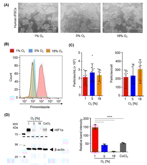 Conditioning of iPSCs at different oxygen levels during EV production. (A) Representative images of iPSC cultures at different oxygen levels as indicated. Scale bar 1000 µm. (B) Formation of oxygen adducts measured by flow cytometry with the hypoxyprobe pimonidazole. Color code as indicated; black line shows unstained sample. (C) Particle concentration and particles secreted per cell per 24 h, by human iPSCs at indicated oxygen levels. Bars represent replicates from three independent experiments. (D) Representative immunoblotting for HIF-1α levels in human iPSCs at different oxygen levels. CoCl2 was used as a positive control for HIF-1α stabilization. Protein quantification (relative band intensity) normalized to total protein loaded (right graph in (D)). Bars represent mean ± SD results from three independent replicates (**** p < 0.0001).