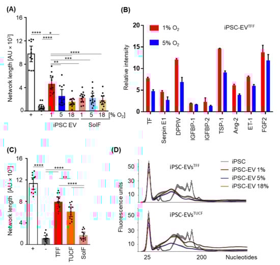 Angiogenic potential of iPSC-EVs obtained after iPSC conditioning at different oxygen levels. (A) Total length of the endothelial networks in the absence (white bar, positive control; grey bar negative control) or presence of iPSC EVs and corresponding soluble factors (SolF) obtained at defined oxygen levels as indicated and separated by tangential flow filtration (TFF), respectively (**** p < 0.0001, *** p < 0.001, ** p < 0.01, * p < 0.05). (B) Angio-profiler Western blot array of TFF-enriched iPSCs (duplicate analysis on one randomly selected EV preparation) normalized by equal EV number input. (C) Total length of endothelial networks in the absence or presence of iPSC-EVs derived from hypoxic iPSC culture and produced by TFF or TFF plus ultracentrifugation (TUCF) or by adding EV-depleted soluble factors (SolF) obtained as TFF retentate from 1% oxygen culture conditions. Bars represent pooled results from three independent experiments (**** p < 0.0001, ** p < 0.01). (D) Electropherogram analysis of different RNA samples isolated from TFF- (top) and TUCF-purified EVs (bottom) derived from different oxygen conditions as indicated and run on a Bioanalyzer RNA pico chip (mean ± SD; n = 3). Grey curves represent the small RNA profile of the same parental iPSCs in both histograms for comparison.