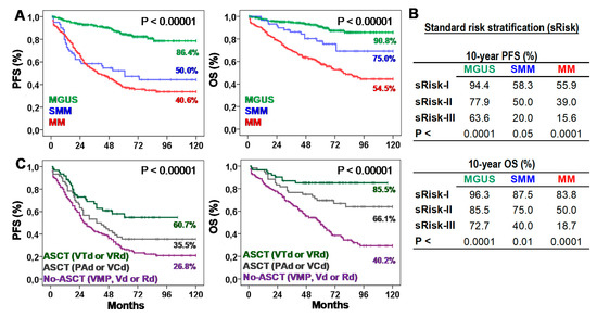 Survival of patients according to the type of plasma cell neoplasm (PCN), their standard risk or the type of first-line treatment. (A) Kaplan-Meier and Log-rank tests for Progression-Free (PFS) and Overall Survival (OS) according to the type of PCN: monoclonal gammopathy of undetermined significance (MGUS), smoldering multiple myeloma (SMM), or multiple myeloma (MM). Ten-year survivals are shown for each PCN type. (B) Ten-year PFS and OS rates (estimated with Kaplan-Meier and Log-rank tests) according to the standard risk (sRisk) for MGUS [30], SMM [7], and MM [8] patients: low (sRisk-I), intermediate (sRisk-II), and high (sRisk-III). (C) Kaplan-Meier and Log-rank tests for PFS and OS according to the type of first-line treatment: No-autologous stem cell transplantation (ASCT) with VMP, Vd or Rd; ASCT with PAD or VCD; or ASCT with VTd or VRd. Ten-year survivals are shown for each treatment.