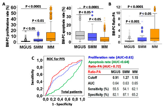 Biological characteristic of bone marrow plasma cells (BM-PCs) in patients with monoclonal gammopathy of undetermined significance (MGUS), smoldering multiple myeloma (SMM), or multiple myeloma (MM) and their prognostic capacity for progression-free survival (PFS). (A) Quantification of BM-PCs proliferation and apoptosis rates in MGUS, SMM, and MM patients. (B) Proliferation-to-apoptosis ratio (Ratio-PA) of BM-PC in MGUS, SMM, and MM. (C) Receiver-operating characteristic (ROC) analysis of proliferation and apoptosis rates and Ratio-PA for PFS in total patients. Table shows cutoff values with maximum prognostic capacity for PFS, area under the curve (AUC), sensibility, and specificity of Ratio-PA in MGUS, SMM, and MM patients.