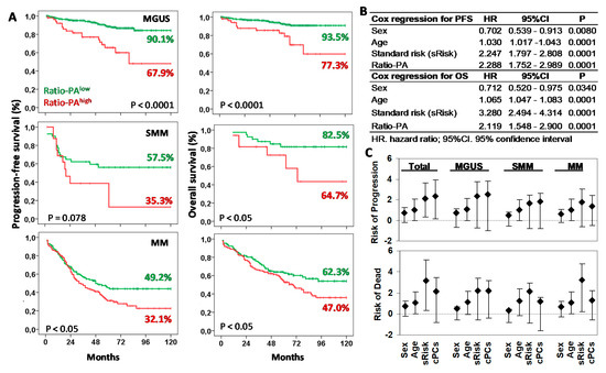 Prognostic capacity of Ratio-PAhigh for progression-free survival (PFS) and overall survival (OS) of plasma cell neoplasm (PCN) stages. (A) Kaplan-Meier and Log-rank tests for PFS and OS according to the high or low Ratio-PA in patients with monoclonal gammopathy of undetermined significance (MGUS), smoldering multiple myeloma (SMM), or multiple myeloma (MM). Ten-year PFS and OS are indicated in the plots. (B) Cox regression analysis for PFS and OS for sex, age, standard risk stratification (sRisk), and Ratio-PA of bone marrow plasma cells in total patients. (C) Hazard ratio (HR) and 95% confidence interval for progression or death in total, MGUS, SMM, and MM patients observed in the Cox regression analysis.