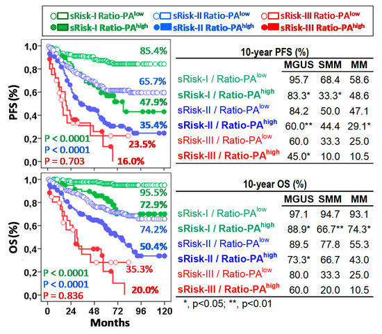 Similar results were observed for each type of PCN. According to the low/high Ratio-PA, MGUS, SMM, and MM patients showed 10y-PFS rates of 95.7%/83.3% (p < 0.05), 68.4%/33.3% and 58.6%/48.6% for sRisk-I; 84.2%/60.0% (p < 0.01), 50.0%/44.4% and 47.1%/29.1% (p < 0.05) for sRisk-II, and 60.0%/45.0%, 33.3%/10.0% and 25.0%/10.5% for sRisk-III, respectively; and 10y-OS rates were 97.1%/88.8%, 94.7%/66.6% (p < 0.01) and 93.1%/74.2% (p < 0.05) for sRisk-I, 89.5%/73.3% (p < 0.05), 77.8%/66.7% and 55.2%/43.0% for sRisk-II, and 80.3%/60.1%, 33.3%/20.0% and 25.0%/10.5% for sRisk-III, respectively (Figure 4, right plots).