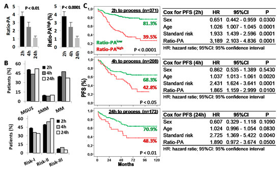 Time from bone marrow (BM) extraction to laboratory processing reduces the prognostic capacity of the Ratio-PA. (A) Ratio-PA of BM plasma cells and proportion of patients with Ratio-PAhigh for samples processed 2 h, 4 h, or 24 h after BM extraction. (B) Distribution of patients by the plasma cell neoplasm (PCN) stage and the standard risk (Risk) group according to the processing time. (C) Kaplan-Meier and Log-rank tests for progression-free survival (PFS) according to Ratio-PA (high/low) in total PCN patients and according to the time until processing; and Cox regression analysis of PFS for sex, age, standard risk stratification, and Ratio-PA for samples processed 2 h, 4 h, or 24 h after BM extraction.