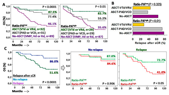 Higher 10y-OS rates observed in patients with Ratio-PAhigh treated with ASCT and VRd/VTd were related to a lower relapse rate than the one for patients treated with ASCT and PAD/VCD or No-ASCT (27.8% vs. 73.7% and 78.3%, p < 0.01). In the same line, high 10y-OS rates observed in patients with Ratio-PAlow treated with ASCT, either with PAD/VCD or VRd/VTd, were associated with low relapse rates, 37.5% and 44.4% respectively, compared to the relapse rate of patients not eligible for ASCT (63.6%) (Figure 6B).