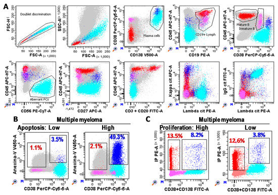 Plasma cell (PC) immunophenotyping. (A) Flow cytometry analysis of bone marrow samples performed with FACSCanto-II and DIVA Software (Becton Dickinson, San Jose, CA, USA). Photomultiplier (PMT) voltages were adjusted daily using CS&T beads (BD). Fluorescence compensations were finely adjusted using negative events as reference for each fluorochrome. A total of three million white cells were stained for each tube, tube-1: CD3&CD20 FITC, CD19 PE, CD38 PerCP-Cy5.5, CD56 PE-Cy7, CD27 APC, CD45 APC-Cy7, Annexin-V V450, and CD138 BV510 (BD); and tube-2: cyIgG, cyIgA, cyIgD, or cyIgM FITC, cyLambda PE, CD38 PerCP-Cy5.5, CD56 PE-Cy7, cyKappa APC, CD45 APC-Cy7, CD19 BV421, and CD138 BV510 (BD). One million cells were recorded for each tube. After doublet discrimination (in a FSC-H/SSC-A dotplot), total PC (Blue) were identified as CD38+++CD138+/++ events. Aberrant PC (cyan) were identified as CD45low/negative and/or CD19low/negative and/or CD20+ and/or CD27low/negative and/or CD56+ and/or monoclonal restriction for the heavy and/or light immunoglobulin chains (specific gating strategy was follow for each patient based on their phenotype). Mature B cells (red) were identified as lymphocytes (FSC/SSClow) CD19+CD45++CD38−/+low. Immature B lymphocytes (pink) were defined as CD19+CD45lowCD38++. Grey cells are non-B non-PC cells. (B,C) Bone marrow PCs (CD38+CD138+) from MM patients with low and high apoptosis (Anexin-V+ blue and red events for PCs and B lymphocytes, respectively) and proliferation rates (S + G2/M phases of the cell cycle), respectively.