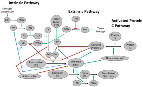 Blood coagulation pathway. Green arrows correspond to the activation of various factors in the blood coagulation pathways; red arrows represent the inhibitory regulation of blood coagulation pathways; and blue arrows show the feedback loop of thrombin.