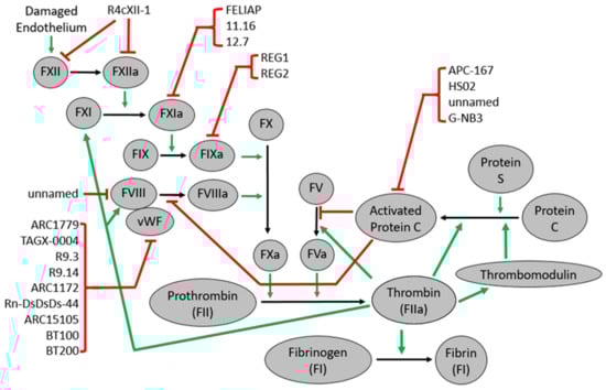 Factor IX (FIX) converts to factor IX (FIXa) either from FXIa or TF/FVIIa complex. Once activated, FIXa forms a complex with factor VIIIa, before activating factor X (Figure 1). Aptamers targeting factor IX and factor IXa have been evaluated as anticoagulants in several clinical trials [,,,]. The modified RNA aptamer, 9.3t, binds the extended substrate-binding site (exosite) of FIX and FIXa. Aptamer 9.3t inhibits FX activation without inhibiting the FVIIIa/FIXa complex [] (Figure 3). The antidote oligonucleotide, 5-2, which is composed of nucleotides complementary to a portion of the 9.3t aptamer, reverses anticoagulation induced by 9.3t within 10 min in vitro []. This groundbreaking study was the first to demonstrate that a complementary oligonucleotide strand can reverse an aptamer’s effects []. This anticoagulant-antidote pair of direct factor IXa inhibitor pegnivacogin (RB006) and its antidote anivamersen (RB007) is named REG1, which was developed by Regado Biosciences and tested in patient trials.