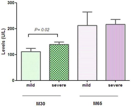 However, the data are conflicting due to recent studies that have shown low sensitivity and poor diagnostic performance of CK18 tests [86,87]. Our preliminary data on the evaluation of circulating levels of CK18-M30 fragments and CK18-M65 with ELISA Kit-PEVIVA (DiaPharma) have demonstrated that the subjects with severe steatosis had significantly higher plasma levels of CK18-M30 fragments compared to subjects with mild steatosis (Mann–Whitney Test). No statistically significant difference was observed in CK18-M65 fragment levels between two groups of NAFLD patients studied (Figure 1). The CK18-M30 is specifically indicative of apoptosis, whereas the CK18-M65 is indicative of total cell death (apoptosis and necrosis).
