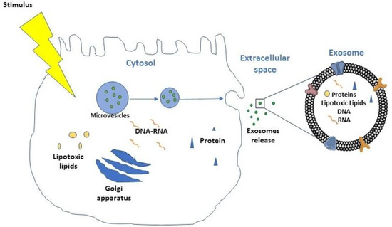 Exosomes have been identified as effective cell–cell communicators that contain a specific load from the cell of origin. They are able to transfer this load to a target or an acceptor cell, with consequent modification of the activity of the recipient cell. Abundant evidence suggests that exosomes are involved in many liver injuries, such as alcoholic and nonalcoholic fatty liver disease, liver fibrosis, cirrhosis, and hepatocellular carcinoma [43]. The exosomes are produced not only from parenchymal cells (hepatocytes), but also from non-parenchymal cells (hepatic stellate cells, endothelial, cholangiocytes, Kupfer cells, and liver endothelial cells, are directly involved in the progression and evolution of NAFLD [44].