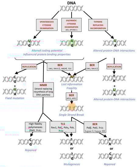 Cellular processing and physiological consequences of the genomic uracils are highly context-dependent (Figure 1). Cytosine deaminations result in uracil:guanine (U:G) mismatches that can be fixed as point mutations upon the next replication in one of the daughter cells unless repaired by base excision repair (BER) or mismatch repair (MMR) mechanisms. Thymine-replacing incorporation is less harmful because the DNA coding potential is not changed, however, the missing methyl label from the uracil base as compared to thymine (T) might result in the perturbation of certain DNA binding regulatory functions [16]. Recently, genomic uracil was suggested as a potential epigenetic marker [1,17].
