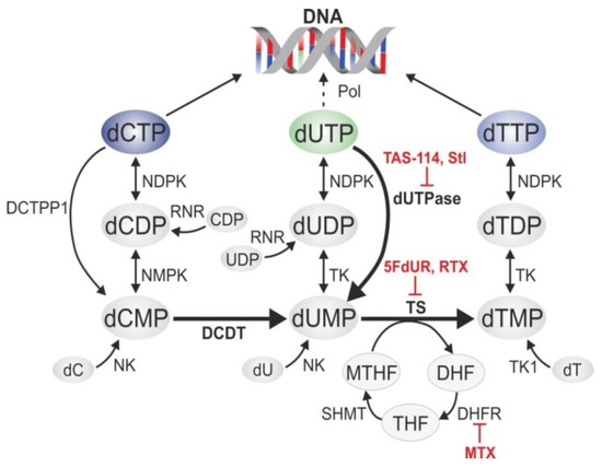 The biosynthetic pathways of pyrimidine nucleotides have evolved to keep an extremely low cellular dUTP/dTTP ratio to minimize the frequency of thymine-replacing uracil incorporation (Figure 2) [1]. Within this network, some enzymes show strict substrate specificity, such as dCMP deaminase (DCTD) [51,52], deoxyuridine triphosphatase (dUTPase) [53], and thymidylate synthase (TS) [54], which are dedicated to efficiently catalyze specific reactions producing dUMP and dTMP, respectively (Figure 2). Other enzymes in these pathways have a wider substrate pool: nucleoside-diphosphate kinase (NDPK), nucleoside-monophosphate kinase (NMPK), and dTMP kinase (TK) act on nucleotides containing different bases. Nucleotide kinases (NK and TK1) are involved in salvage pathways utilizing 2′-deoxynucleosides from external sources to produce the corresponding 2′-deoxynucleotide-monophosphates. The folate cycle (involving dihydrofolate reductase (DHFR) and serine hydroxymethyltransferase (SHMT)) is essential to recycle methylene-tetrahydrofolate (MTHF), the co-substrate of TS that serves as a methyl donor for dTMP synthesis.