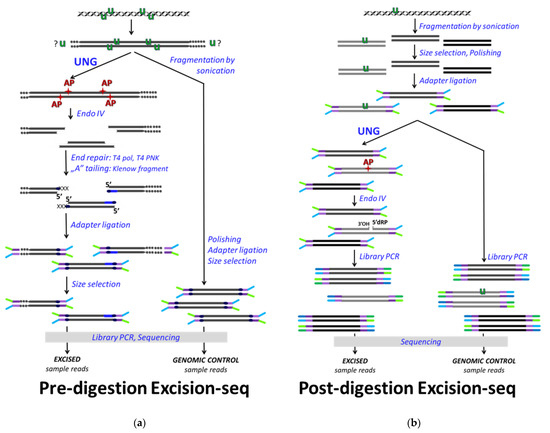 The first published method applied for genome-wide uracil mapping was the Excision-seq applied in E. coli and yeast [110]. Excision-seq also operates with the coupled enzymatic reactions of bacterial UNG and the AP endonuclease, ENDO IV, and combines this with massively parallel DNA sequencing (NGS). Two versions had been developed: the pre-digestion (Figure 3a) and the post-digestion Excision-seq (Figure 3b). The pre-digestion version requires high uracil content within the studied DNA sample that allows efficient DNA fragmentation already by the in vitro UNG/ENDO IV enzymatic treatment. Then, applying a size selection without additional fragmentation procedure, the sequencing library is prepared. The ligation position of the sequencing adapter at the 5′ ends will report on the original sites of uracils with practically a single-base resolution (Figure 3a), similarly to the ligation mediated PCR method [99] described above. As a complementary approach, post-digestion Excision-seq applies UNG/ENDO IV treatment on the prepared DNA fragment library, and the increased read coverage in the sequencing results of the excised samples compared to the non-treated controls indicates genomic regions from which uracils were excluded. However, the sensitivity of such inverse approach highly depends on the sequencing depth and requires a rather uniform genome coverage, which might limit the size and the complexity of the genomes addressed by this technique. The two versions of Excision-seq were reported as adequate methods for the efficient detection of elevated uracil levels upon dUTPase and UDG deficiency in smaller genome sizes, as in E. coli and yeast strains [110]. They concluded that uracil is excluded from the very early and very late replication timing genomic segments and assumed that such regulation might involve the alterations of the cellular dNTP pool during the DNA synthesis [110]. Nevertheless, a larger genome size (e.g., mammalian genomes) and the low frequency and/or the nature of the distribution of uracils might result in some biases or underestimation using Excision-seq method, especially its pre-digestion version. In this aspect, enrichment or pull-down-based methods might be more efficient. Moreover, it has not yet been demonstrated how beneficial the single base resolution capability of pre-digestion Excision-seq is. Indeed, the same group used this method addressing the 10 kb-size HIV genomes from different in vitro infected immune cells showing uniformly distributed uracilation of the proviral genome [100]. Although this method was also extended to the mapping of other DNA base modifications [111] and cited by reviews or other research papers, Excision-seq has not yet become widely used to characterize other biological systems. In one case, pre-digestion Excision-seq was applied as a complimentary technique to support the results from dU-seq (which will be discussed later [112]).