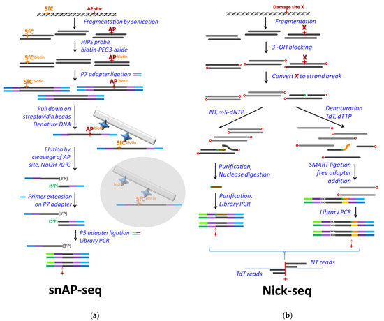The other similarly creative method is Nick-seq, developed by Dedon’s group for single-nucleotide resolution genomic maps of different DNA modifications and damage [120] (Figure 4b). The method relies on conversion of the modified bases into single strand breaks on which two different types of polymerase reactions are performed separately. One portion of the sample is subjected to nick translation using α-thio-dNTPs to produce hydrolysis-resistant oligonucleotides downstream of the single strand break. Hence, the rest of the DNA can be selectively removed by exonuclease III and RecJ, and the resistant phosphorothioate-containing oligos can be sequenced. The second portion of the sample is used for poly(dT) tailing of the 3′ end at the strand break by terminal transferase (TdT). Then, this tail is used for library preparation. By this approach, sequencing of the two separately processed samples can confirm the position of a base modification from two directions.