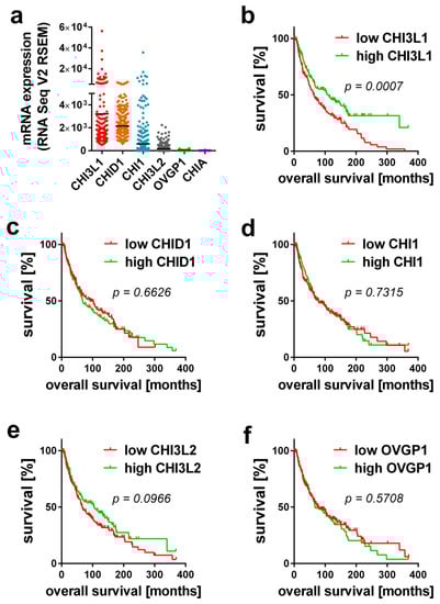 Analysis of public transcriptome data of melanoma patients. (a) Expression levels of mammalian chitinases in human melanoma tissue. (b–f) Kaplan-Meier curve presentation of the patients’ overall survival in correlation to the expression of (b) CHI3L1, (c) CHID1, (d) CHI1, (e) CHI3L2 and (f) OVGP1. Exact p-values of the performed log-rank test are indicated.