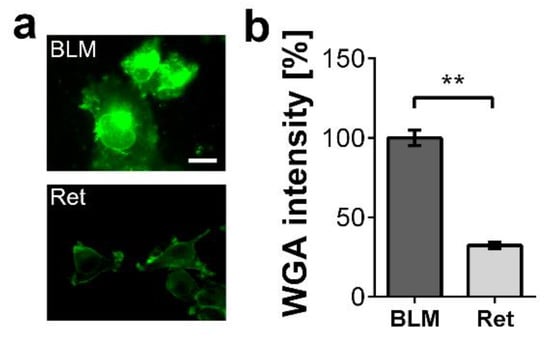 Fluorescence microscopy was performed as previously reported []. Briefly, BLM and Ret cells were cultivated on glass coverslips for 24 h. Cells were fixated with 4% paraformaldehyde (Electron Microscopy Sciences, Hatfield, PA, USA), washed three times with PBS and blocked with 2% BSA (Sigma-Aldrich St. Louis, MO, USA) in PBS for 1 h. We stained the cells overnight at 4 °C with FITC-conjugated WGA (Thermo Fisher Scientific, Waltham, MA, USA) diluted 1:1000. Mounted samples were analyzed by fluorescence microscopy (Observer z1, Zeiss, Oberkochen, Germany). Images were analyzed with ImageJ v1.52.