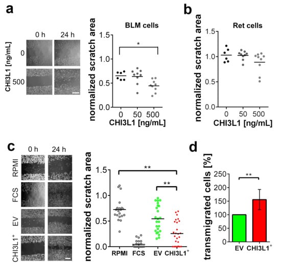 We treated both cell lines with different concentrations of recombinant CHI3L1 and measured their ability to migrate using scratch assays (Figure 3a,b). Ret cell migration was not affected by CHI3L1, while BLM cells showed an increased migratory potential upon treatment with 500 ng/mL recombinant CHI3L1. In further experiments, we overexpressed CHI3L1 in BLM cells and harvested the conditioned medium after 24 h. For the control, we used a conditioned medium harvested from BLM cells transfected with an empty vector (BLM EV). As shown in Figure 3c, Ret cells treated with conditioned medium from BLM cells overexpressing CHI3L1 (BLM CHI3L1+) showed a significantly increased migratory potential. Because scratch assays were not only sensitive to cell migration but also cell proliferation, we used transmigration assays as an additional experimental readout. To this end, we cultivated BLM EV or BLM CHI3L1+ cells in the lower cavity of the transwell chamber, while Ret cells were seeded into the upper cavity. Figure 3d indicate that significantly more Ret cells transmigrate towards the BLM CHI3L1+ cells than towards the EV control BLM cells. Taken together, our experiments suggest that CHI3L1 alone cannot induce Ret cell migration, whereas the conditioned medium of BLM CHI3L1+ promoted the migration of Ret cells significantly.
