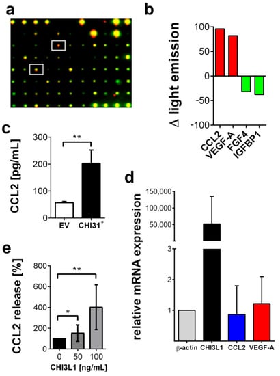 CHI3L1 affects the secretome of BLM cells. (a) Superimposed dot blot membranes probing the supernatants of BLM EV cells (green) and BLM CHI3L1+ cells (red). Red signals indicate proteins upregulated in BLM CHI3L1+ cells, green spots indicate proteins downregulated in BLM CHI3L1+ cells. White boxes mark the spots of CCL2 and VEGF-A. (b) Quantitative summary of the protein array. FGF4 = fibroblast growth factor 4. Additional data are presented in Supplementary Materials Figure S1. (c) CCL2 ELISA of supernatants obtained from BLM EV cells and BLM CHI3L1+ cells. n = 10; ** = p ≤ 0.01 Student’s t-test. (d) Expression analysis of CHI3L1, CCL2 and VEGF-A in BLM CHI3L1+ cells in comparison to BLM EV cells by qRT-PCR. Data were normalized to the expression of β-actin. The expression of CCL2 and VEGF-A was not significantly affected by CHI3L1 overexpression (e) BLM wild-type cells were treated with human recombinant CHI3L1 and CCL2 was measured in the supernatants by ELISA. n = 10; * = p ≤ 0.05, ** = p ≤ 0.01 one-way ANOVA.