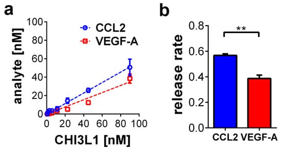 To further test whether CHI3L1 is able to liberate growth factors or cytokines from HS, we established a solid-phase binding assay (Figure 5). HS coated 96-well plates were loaded with recombinant VEGF-A or CCL2 and subsequently treated with different concentrations of CHI3L1 ranging from 0.7 to 90 nM. The amount of VEGF-A or CCL2 liberated from the HS coated 96-well plates was quantified by ELISA (Figure 5a). Both analytes were liberated from the plate by the addition of CHI3L1 in a dose-dependent manner. Figure 5b indicates that the release rate of CCL2 (0.6 ± 0.01) was significantly higher than the release rate of VEGF-A (0.4 ± 0.03; p < 0.01).